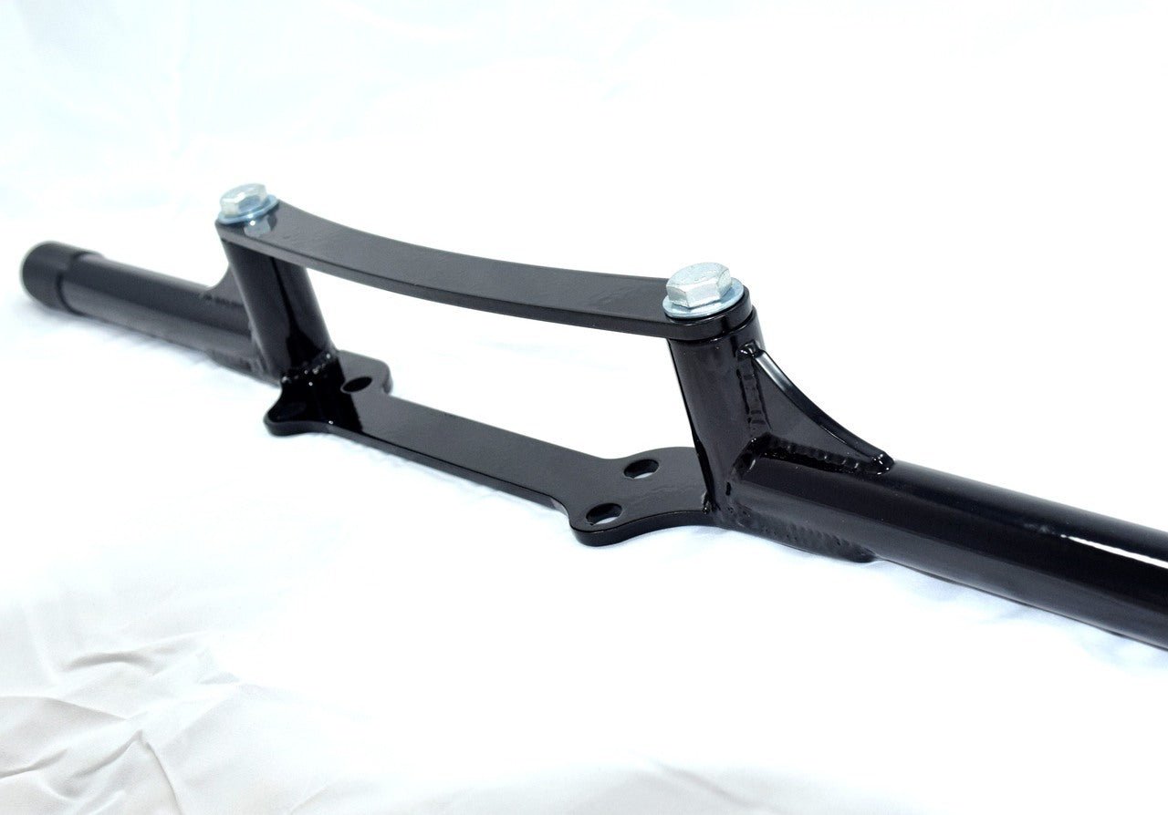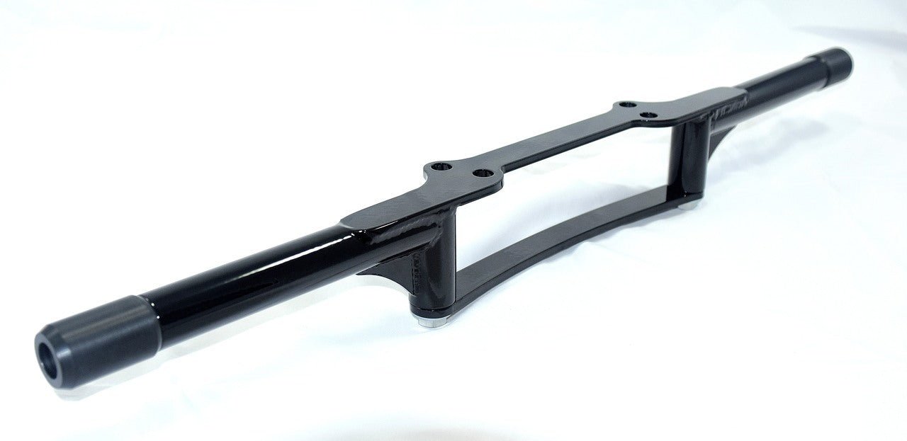 Our passenger peg crash bar works great in conjunction with our Highway Peg Crash Bar. This fully TIG welded assembly takes place of your standard passenger pegs on the 06 and up Dyna's. The location and width is very similar to the stock passenger pegs so that it can be used just as they were originally intended. They also bolt up to the same location as your passenger pegs do. However, they have a lower bracket that helps support the crash bar from any up and down movement, thus making it very rigid. The ends of the bar feature replaceable Delrin pucks to keep the bike slipping over the pavement as opposed to taking hold of it. When this crash bar is used along side our front crash bar, it makes it very hard to get the bike to roll over completely to contact the handlebars and tank. In fact, instead of falling completely over, it tends to keep the bike propped up at a steep angle, making it great for practicing lower speed stunts without risk of damage to the bike. Crashbar does interfere with most factory exhaust systems, works with most aftermarket 2 into 1 systems. For proper clearance you should have a 1-1/8" gap between the top surface of the swing arm to the top of the pipe at the passenger peg location.