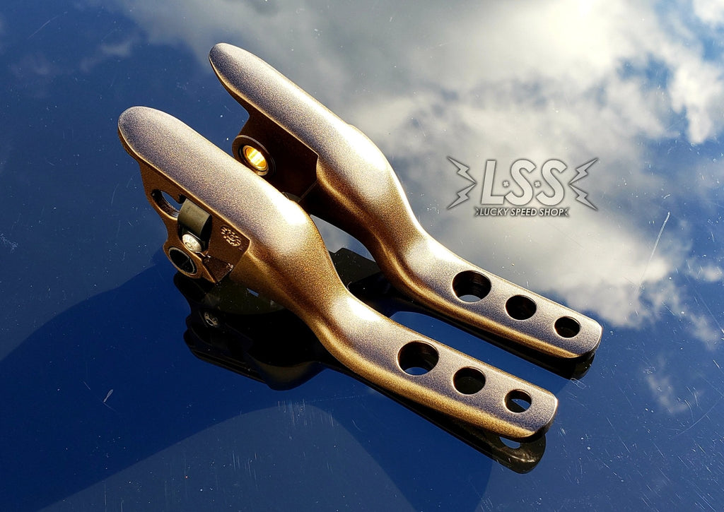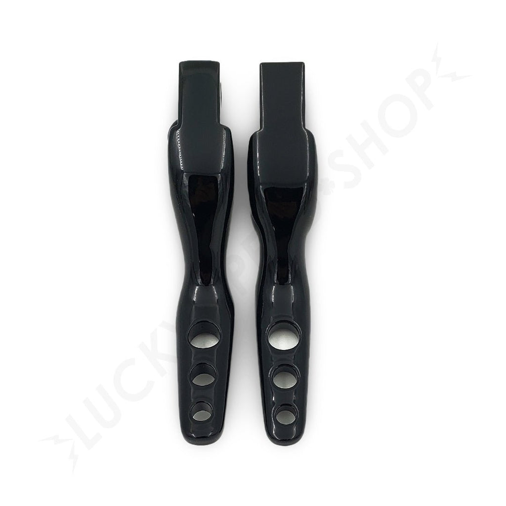 Lucky Speed Shop "6blocc style" levers, drilled for your pleasure, and 2-1/8" shorter than stock for a comfortable two finger cruising grip. These levers easily fit three fingers in case you need a little extra braking/clutching strength when you're flying low.