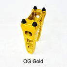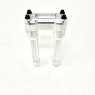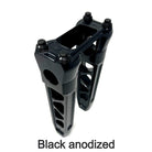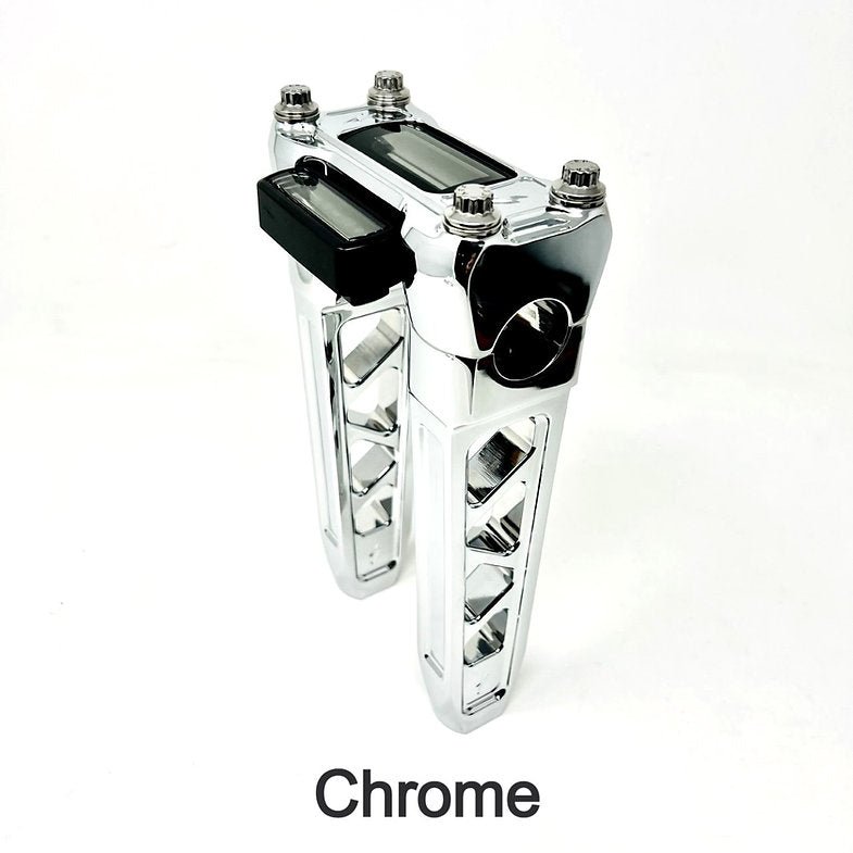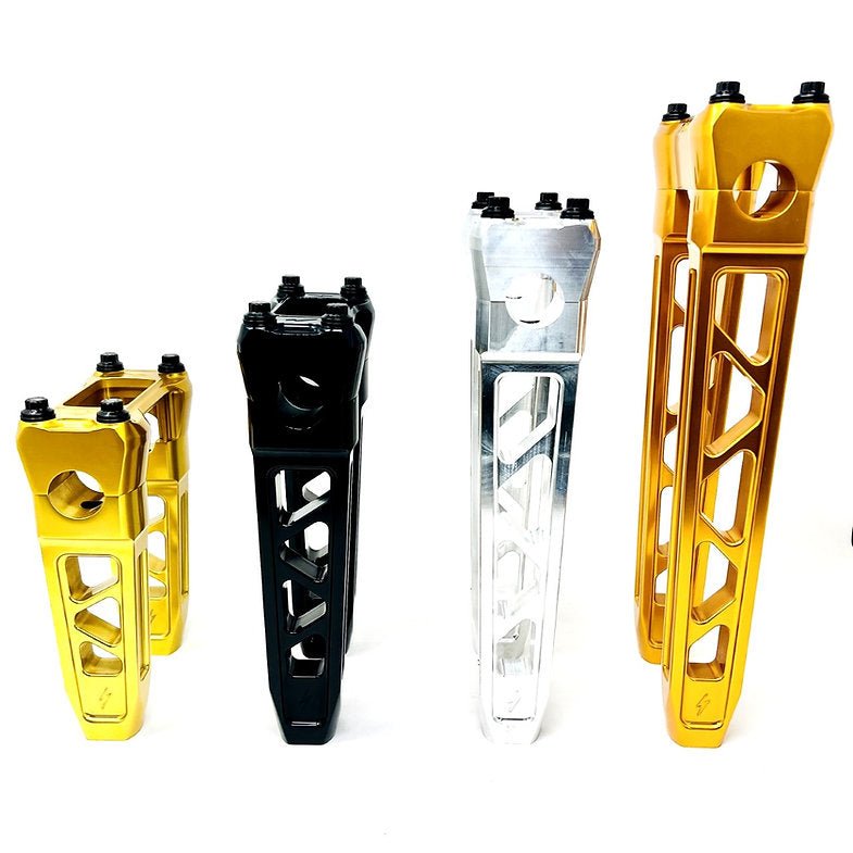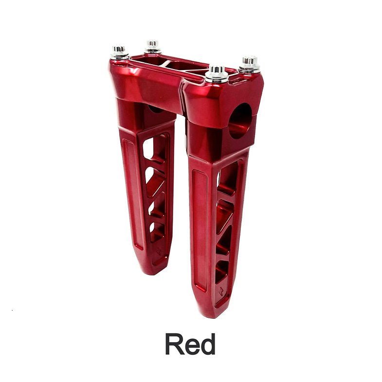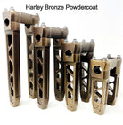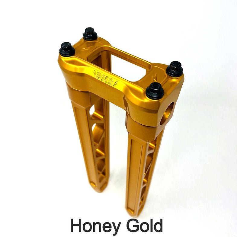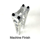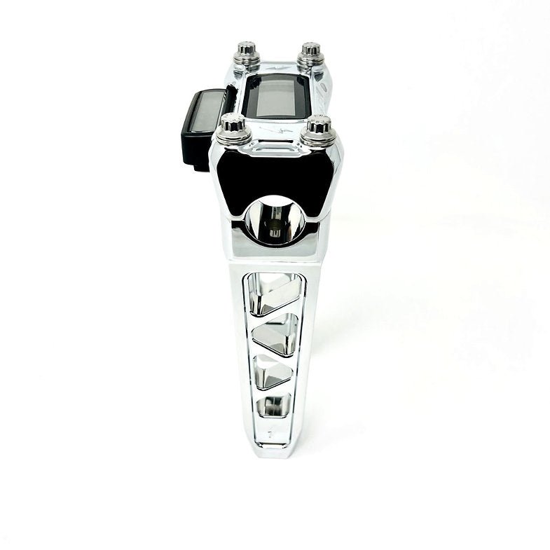VERSION 2 DEATH METAL RACING STRAIGHT DESTROYER RISERS made from 6061 T-6 aircraft grade aluminum. Available in 6" 8" 10" and 12". Made for 1-1/8" bars AND will work with 1" bars with our 1-1/8" to 1" adaptor reducers SOLD SEPARATELY IN THE HAND CONTROL SECTION ON THIS SITE. No need to buy new risers when you change your bars, we have you covered. Risers have a 1/2" hole drilled in the clamping area for wiring to exit and feature polished 12pt stainless or 12pt black plated chromoly bolts for the top clamp.**The black plated chromoly bolts can possibly rust if exposed to the elements** Top clamp bolt spacing works with 4-1/4" OEM style gauge mounts. 100% American made. Available in a variety of finishes.