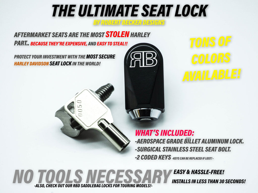 Want some cheap insurance for that nice seat you have!? Robert Becker Designs has your answer. A first of its kind Maximum Security seat lock with NO TOOLS REQUIRED for install and works with your Factory or Aftermarket seat! All Locks & keys have an assigned key code in case anything happens to your key. Keep your seat protected with RBD Seat Lox!
